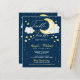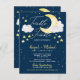 Theme Parties Twinkle Twinkle Little Star budget-friendly gender-neutral shower invitation (4.25 x 5.6 in.) design features watercolor elements including a cute watercolor moon floating on watercolor clouds and surrounded by yellow watercolor stars. Our gender neutral shower invitation design is accented with tiny little stars and hand-lettered brush typography and set on navy blue background. Script accent typography is paired with modern block lettering. #BabyShower #ItsABoy #Invitations #BudgetBabyShower