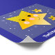 A cute design featuring three golden stars with big faces. Pink rosy cheeks and noses. A deep blue background with little snowflakes in the background.