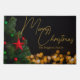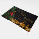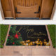 This gorgeous custom Merry Christmas doormat features modern gold handwritten script over twinkling lights next to a festive Christmas tree that is decorated with red and green ornaments. Customize this elegant holiday outdoor decor with personalized script over the black night sky.