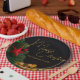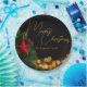 These gorgeous Merry Christmas party paper plates feature modern gold handwritten script over twinkling lights next to a festive Christmas tree that is decorated with red and green ornaments. Customize this elegant holiday celebration decor with personalized script over the black night sky.