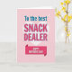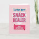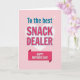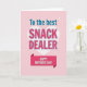This card features a soft blush pink background sprinkled with tiny white dots and four-point star shapes that feel like a gentle sparkle, with a sweet, friendly tone ❤️. In the center, a large white heart holds the main message, creating a cozy focal point that reads like a warm inside joke between loved ones. Near the top of the heart, the words “To the best” sit in teal lettering, small and neatly placed as an intro line. Directly below, “SNACK DEALER” appears in big uppercase fuchsia letters edged with a light blue outline, giving the phrase extra pop and a fun, affectionate emphasis. The color pairing of teal, fuchsia, and pale pink keeps the look light while still energetic, like a cheerful wink shared between close family or friends. Along the bottom, a folded ribbon-style banner in matching fuchsia stretches across the width, grounding the layout and adding a celebratory finish 🌼. Inside that banner, “HAPPY MOTHER’S DAY!” is written in white, simple sans-serif letters that stand out sharply against the darker pink. Small white specks and starbursts continue to dot the pink space around the heart and banner.