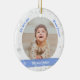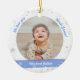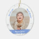 Trendy, elegant, and cute personalized First Christmas Baby Ornament for twin baby boys for a favorite uncle with a white frame with snowflakes and stars that has a round opening for a custom horizontal photo, and a curved blue band on each side on which appears the name or names of the twins in an elegant script font / typography. This design includes on the front the words "We love you, Uncle Jason!", which you can personalize or delete. On the back there's a custom text for the year of the babies' first Christmas.