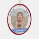 Trendy, elegant, and cute personalized First Christmas Baby Ornament for twin baby boys for a favorite uncle with a white frame with snowflakes and stars that has a round opening for a custom horizontal photo, and a curved blue band on each side on which appears the name or names of the twins in an elegant script font / typography. This design includes on the front the words "We love you, Uncle Jason!", which you can personalize or delete. On the back there's a custom text for the year of the babies' first Christmas. With an outer Xmas red frame.