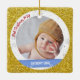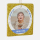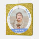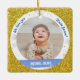 Trendy, elegant, and cute personalized First Christmas Baby Ornament for twin baby boys for a favorite uncle with a white frame with snowflakes and stars that has a round opening for a custom horizontal photo, and a curved blue band on each side on which appears the name or names of the twins in an elegant script font / typography. This design includes on the front the words "We love you, Uncle Jason!", which you can personalize or delete. On the back there's another photo and custom text for the year of the babies' first Christmas. With a (faux) gold glitter outer frame.