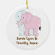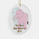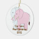 Sweet Christmas ornament, with adorable graphics of a blue striped and a pink polka dot elephant holding trunks. Brown text below reads, Our Twins First Christmas, with the year. On the back are the same colorful elephants with the names in brown text. Personalize all the text for your children's first Christmas.