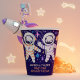 This joint first birthday 'first trip around the sun' design features two astronauts floating in space surrounded by stars, planets, and shooting stars, on the back of the cup are two rockets on a dark purple background. This design is ideal for a twins first birthday but can be fully customisable to suit any age of any event. See the whole matching collection.