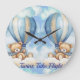 Adorable blue and white air balloons float away with sweet twin teddy bears on board. Perfect for a twins' nursery.