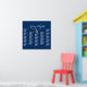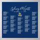 Nautical anchors seating chart poster in navy blue, for a large reception. Square shape comes in various sizes with sections to add guests' names alphabetically or by table number. White script at top for first names of the bride and groom in modern handwritten font. All the rest is white printed text with date of event beneath the names. The two gold anchors are beneath that and table listings are staggered in vertical rows. Sections will hold up to 22 tables, or delete sections for your needs.