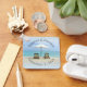 Wedding key ring favors with two beach chairs in the sand and custom text. Personalize with names at the top and wedding date at the bottom. Bulk order discounts apply when buying this type of key chain. Empty chairs beneath a white umbrella look out over turquoise ocean water. This is a favor wedding guests will want to use.