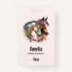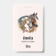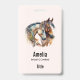 Name badge with an image featuring a pair of horses. Wearing decorative headbands. Surrounded by feathers and foliage.