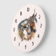 A clock with an image featuring a pair of horses. Wearing decorative headbands. Surrounded by feathers and foliage.