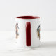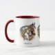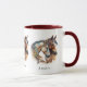 A mug with an image featuring a pair of horses. Wearing decorative headbands. Surrounded by feathers and foliage.