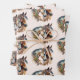 Wrapping paper sheets with an image featuring a pair of horses. Wearing decorative headbands. Surrounded by feathers and foliage.