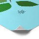 A pair of chickadees sitting on a tree branch with decorative leaves on a light blue backgroung