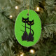 This Christmas tree ornament features a graphic of two black cats with yellow eyes, tall necks, and long tails to look like the letter H for Halloween. The background is a bright green and can be changed by choosing the customize it button.