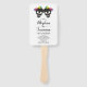 Two skull brides and confetti in rainbow colors Halloween lesbian hand fan wedding program. This wedding design features the skulls of two brides with bows in rainbow colors. The back includes a band of a pattern of colorful confetti.