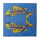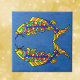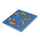 This decorative ceramic tile has a deep blue background with two brightly colored abstract fancy fish with scales in yellow, orange, and blue.