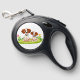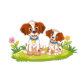 Two brown dogs with collars sitting on a green field with flowers, cartoon style bright colors, simple background.