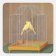 This design features a painting by the Italian artist Antonio Donghi (1897–1963). It shows two yellow canary birds sitting on a wooden perch in their metal cage. The birds are facing in opposite directions from each other, so one bird's tail is next to the other bird's head. There appears to be a piece of lettuce or some other greenery at the bottom of the cage. The cage is resting on a table, which is covered by a green tablecloth. The table is up against the wall, which is decorated in orangey brown wallpaper. The yellow birds seem relaxed and contented in their cage.