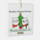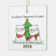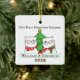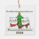 Two white cats wink at each other with red and white polka dot bandanas with a Christmas tree behind them. Our First Christmas Engaged is above the cats, with personalized names under them and the year, which is an outline with red and green numbers placed outside the outline. So cute! On the back, there is a Christmas tree with a heart on top and a small text box for leaving a sweet note. This design is ideal for cat lovers and cat owners who are spending their first Christmas together as an engaged couple.