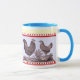Unique Mug featuring an antique image of a chicken and a rooster. Text can be added to the yellow band at the top if desired.