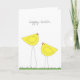 This folding card is printed with a hand-drawn Easter design featuring two long-legged chicks standing in grass. The message "happy easter" is typed above.