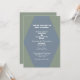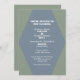 A very modern wedding invitation on a Balsam Fir Green background with a Lucid Blue diamond shape frame of the details.