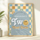 This groovy boys 2nd birthday welcome sign captures retro 70s vibes with a cute blue theme, and a pastel chequered pattern. It includes space to add your boys name in a fun script. Perfect for a "Two Cool Dude" boho birthday.