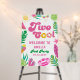 This tropical summer pool birthday party welcome sign features tropical leaves, tropical flowers,pool tire, sun glasses, ice cream and a flip flop sandal, A Perfect summer pool 2nd birthday two cool theme photo birthday welcome sign