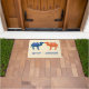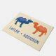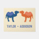 Wipe your hooves or your feet, as the case may be, in style on this personalized camel doormat. This welcome mat is perfect for couples and features cartoon style illustrations of bactrian or two-humped camels in orange and blue with your names or other message below in blue.