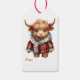 On each side of this Holiday gift tag for kids is a cute cow wearing winter clothing. On one side, a white cow wears a red and white Santa Claus hat and a plaid scarf. On the other side a shaggy Highlands cow wears his plaid winter coat. The text on each side can be easily personalized, or customized by you.