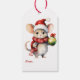On one side of this Holiday gift tag is the image of an adorable little mouse wearing a red and white Santa Claus hat and scarf, and standing in front of a decorated Christmas tree. The other side has another mouse holding a Christmas decoration. The text on each side can be easily personalized, or customized by you. Cute for kids and adults, too!