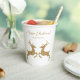 Destei's jumping deer shapes in digitally created faux golden yellow glitter texture. The two deer are facing each other and there are two personalizable text areas above them. PLEASE NOTICE: The design is a digitally created image that will be printed on the product.