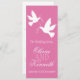 Double-sided simple two white doves with two pink ribbons wedding reception dinner menu. Uniquely designed by Sarah Trett.