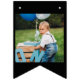 This bunting banner features a red, black and white race car themed design for a 2 year old, with the popular saying "too fast". Personalize it by adding custom photos along with your child's name and age.