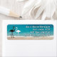 Two flamingos beach address labels with three or four lines of text. Beach scene skinny labels have bold "shadow" font style in white over turquoise water blue. The flamingo couple is black and white.