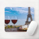 Two glasses of red wine with snacks with view of Paris and Eiffel tower. Glass of red wine with different snacks - plate with ham, sliced, blue cheese. Couple, romantic celebration. Cafe with view.