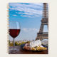 Two glasses of red wine with snacks with view of Paris and Eiffel tower. Glass of red wine with different snacks - plate with ham, sliced, blue cheese. Couple, romantic celebration. Cafe with view.