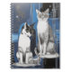Notebook in an illustration of two cats sit gracefully against a deep blue, abstract background. The realistic fur textures with bold linework and geometric elements, creates a modern, surreal atmosphere. Their expressive yellow eyes contrast strikingly with the cool-toned surroundings.