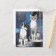 Postcard in an illustration of two cats sit gracefully against a deep blue, abstract background. The realistic fur textures with bold linework and geometric elements, creates a modern, surreal atmosphere. Their expressive yellow eyes contrast strikingly with the cool-toned surroundings.