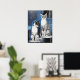 Poster in an illustration of two cats sit gracefully against a deep blue, abstract background. The realistic fur textures with bold linework and geometric elements, creates a modern, surreal atmosphere. Their expressive yellow eyes contrast strikingly with the cool-toned surroundings.