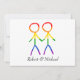 This save the date card features a beautiful and simple design to announce your upcoming wedding. The graphic depicts two men, in the form of elegant stick figures, holding hands. The figures are colored in a beautiful rainbow, symbolizing love and diversity. This card is a wonderful way to bring a cohesive and meaningful touch to your stationery while providing guests with a clear and elegant way to mark their calendars.