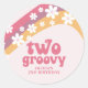 Retro inspired two groovy second birthday invitation sticker with 70's style daisies and boho fonts and colors.