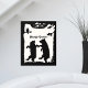 This rectangular wall decal has a black and white image of two dancing bears all in silhouette form in the forest under trees with an owl watching from above. Customize the Happy Dance text with the template.