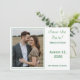 Design features the photo you provide as main design displayed against a white background and framed by an elegant, forest-green colored border. To the right of photo, your text containing heading, names and city & state of wedding are displayed in a matching forest-green font.
