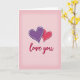 This card shows two overlapping hearts at the center, set against a soft pink background that gets a little darker near the bottom. One heart is bright fuchsia and the other is deep purple, and they sit close together like they’re hugging. Each heart has a white outline with a darker edge outside it, giving a sticker-like look and a bit of depth. The hearts have a slightly drawn look that keeps the design feeling warm and human. Below them, the words “love you” appear in smooth, flowing red lettering, placed near the lower middle of the card. The letters have a light shadow that helps the message stand out on the pale background. Altogether it feels sweet and romantic, perfect for a simple note of affection 💘❤️. Wishing you a lovely day of sharing Valentine’s Day feelings with someone you care about.