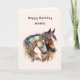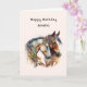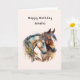 Birthday card with an image featuring a pair of horses. Wearing decorative headbands. Surrounded by feathers and foliage.