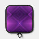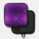 Two images of a purple pot holder with a geometric design. The front shows a vibrant diamond pattern, while the back is plain black with a loop for hanging.
