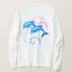 Two cute leaping dolphins play in the ocean, with pretty sunset sky and stars.