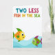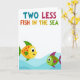 This design shows the phrase “TWO LESS FISH IN THE SEA” stretching across the top two-thirds of a bright white background, with each letter in a different color like teal, hot pink, orange, yellow, and green. The lettering has a slightly uneven, drawn look that gives it a friendly, casual energy. Below the text, two cartoon fish swim close together through soft, wavy lines of cerulean blue, as if they’re sharing the same little corner of the ocean. The larger fish is sunny yellow with red polka dots and green fins, smiling wide and turning its big eyes toward the smaller fish 🥰. The smaller fish is lime green with red spots and magenta fins, smiling back in a way that feels like a quiet, mutual crush ❤️. The words sit centered above them, while the fish occupy the lower portion of the card with plenty of open white space around. Thin blue wave bands ripple horizontally beneath the pair, framing them near the bottom edge.